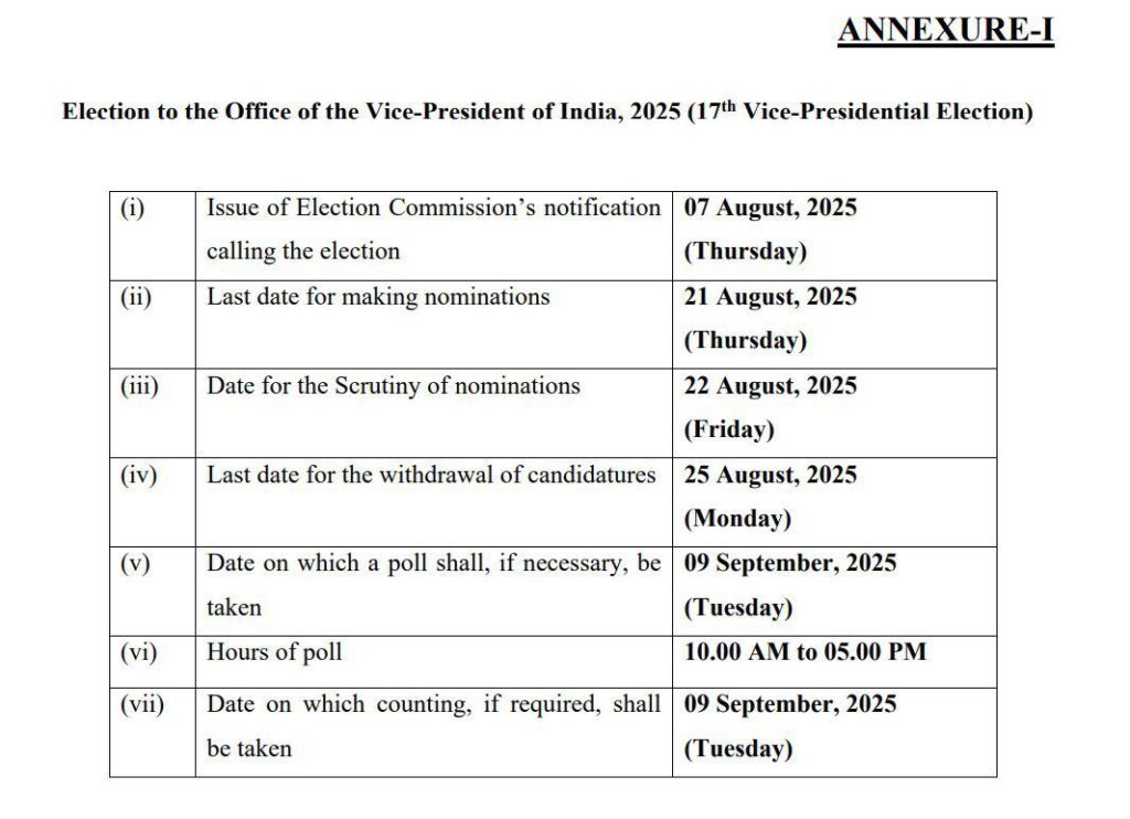 जगदीप धनखड़ के इस्तीफे के बाद उपराष्ट्रपति पद के लिए चुनाव की तारीख का एलान कर दिया गया है। चुनाव आयोग के अनुसार, उपराष्ट्रपति पद के लिए 9 सितंबर को चुनाव होंगे। अधिसूचना 7 अगस्त को जारी की जाएगी। नामांकन दाखिल करने की अंतिम तिथि 21 अगस्त होगी। वही नतीजे मतदान के दिन यानी 9 सितंबर को ही घोषित किए जाएंगे।