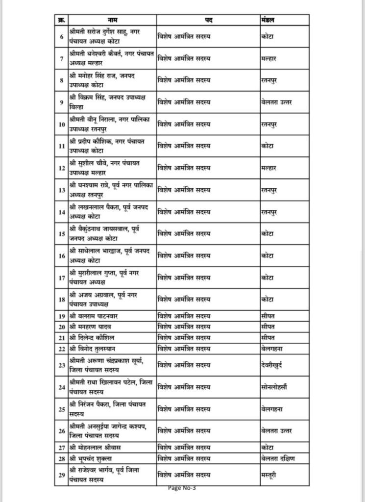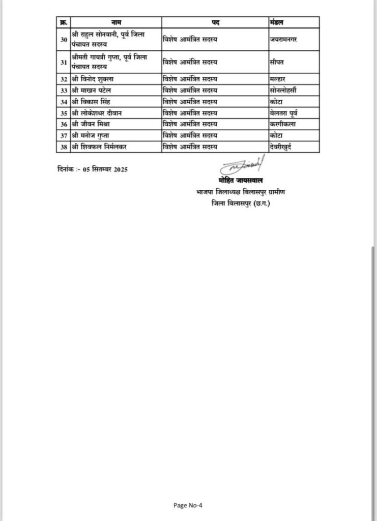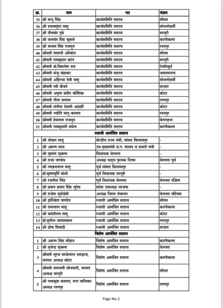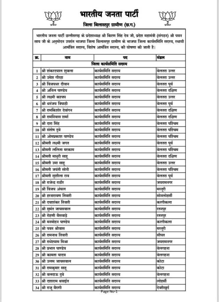 भारतीय जनता पार्टी के प्रदेश अध्यक्ष किरण सिंह देव व भाजपा के प्रदेश महामंत्री संगठन पवन साय जी की अनुशंसा पश्चात भाजपा जिलाध्यक्ष मोहित जायसवाल ने भाजपा जिला ग्रामीण के कार्यकारिणी की घोषणा कर दी जिसमें 51 कार्यसमिति सदस्य,14 स्थाई आमंत्रित सदस्य और 38 विशेष आमंत्रित सदस्यों के नाम शामिल हैं जिलाध्यक्ष मोहित जायसवाल ने बताया कि स्थाई आमंत्रित सदस्यों में जिला के केंद्रीय राज्य मंत्री तोखन साहू डिप्टी सीएम अरुण साव विधायक सुशांत शुक्ला राजा पांडे पूर्व सांसद लखन साहू पूर्व विधायक डॉ कृष्णमूर्ति बांधी रजनीश कुमार सिंह प्रबल प्रताप सिंह जूदेव जिला पंचायत अध्यक्ष राजेश सूर्यवंशी द्वारिकेश पाण्डे रामलाल साहू कांशीराम साहू डॉ सुनील जायसवाल द्रोण त्रिपाठी के नाम शामिल हैं इन सभी सदस्यों की नियुक्ति पर जिलाध्यक्ष मोहित जायसवाल महामंत्री यश मनहर जनक देवांगन ने बधाई दी है