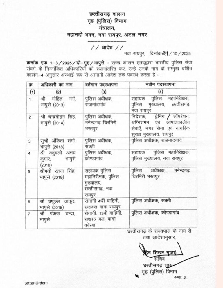छत्तीसगढ़ में 7आईपीएस अफसरो का तबादला, मोहित गर्ग मुख्यालय भेजे गए,, सक्ति पुलिस अधीक्षक अंकिता शर्मा को राजनांदगाव, प्रफुल्ल ठाकुर को भेजा गया सक्ती,