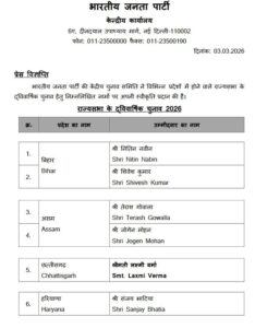 1 min read राष्ट्रीय CG प्रत्याशी घोषित: लक्ष्मी वर्मा होगी भाजपा की राज्यसभा प्रत्याशी, बीजेपी ने जारी की लिस्ट March 3, 2026March 3, 2026 bharat mangwani0 रायपुर 3 मार्च 2026। राज्यसभा के लिए भाजपा ने प्रत्याशी घोषित कर दिया है। लक्ष्मी वर्मा को भाजपा ने राज्यसभा प्रत्याशी बनाया है। bharat mangwani