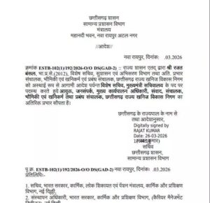 रायपुर। छत्तीसगढ़ सरकार ने प्रशासनिक फेरबदल करते हुए महत्वपूर्ण पदस्थापनों की घोषणा की है। सामान्य प्रशासन विभाग द्वारा जारी आदेश के अनुसार, रजत बंसल को मुख्यमंत्री सचिवालय में पोस्टिंग के साथ जनसंपर्क आयुक्त का प्रभार सौंपा गया है, जबकि रवि मित्तल को प्रधानमंत्री कार्यालय (PMO), नई दिल्ली में उप सचिव पद के लिए रिलीव कर दिया गया है। दोनों निर्णय तत्काल प्रभाव से लागू होंगे।